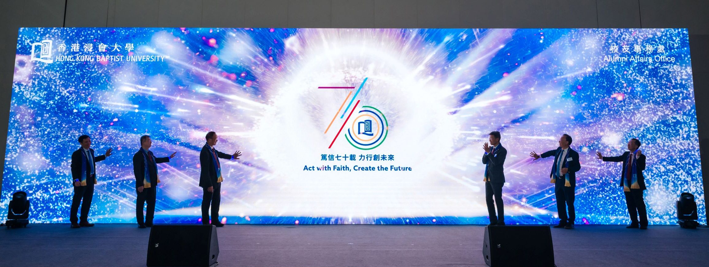 Following his remarks, President Wai was joined on stage by Dr Albert Chau, Vice-President (Teaching and Learning); Professor Daniel Lai, Dean of the Faculty of Arts and Social Sciences; Professor Zhang Han, Dean of the School of Business; Professor Zhong Bu, Dean of the School of Communication; and Professor Michael Ng, Dean of the Faculty of Science, to lead participants in a ceremonial act by unveiling the University’s 70th Anniversary logo and slogan. signifying the year-long celebration of the University.