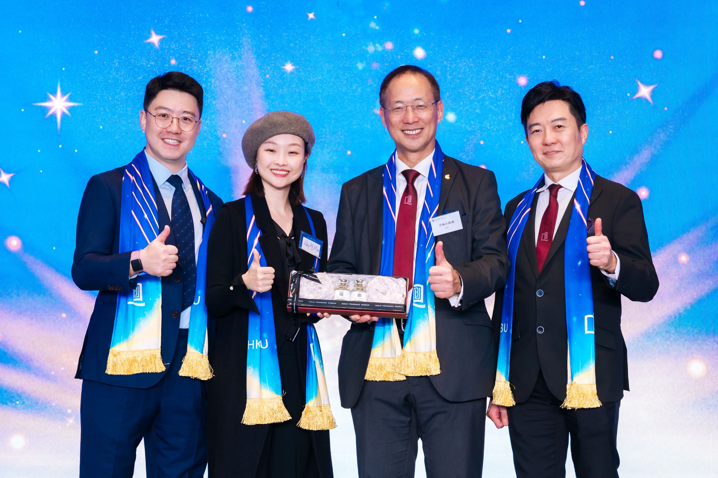 ⁠ Alumni Jacky Fan (middle) and Sandy Xiao (right), representatives of MBA (China) AA also present gifts to President Wai to commemorate the University’s 70th Anniversary.